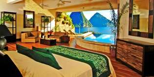- The amenities – The private beach-front is enough to capture most travelers’ attention, but Jade Mountain doesn’t stop there. Guests enjoy access to spa services, infinity pools, activities such as snorkeling, tennis, swimming, walks, hikes and more. The rooms are designed to serve as “sanctuaries.” Private infinity pools and decks create a careful balance between the inside nature of the rooms and the outdoor beauty the Caribbean is known for. On-site and in-sanctuary dining is also available with menus that are designed to please even the most finicky of eaters.